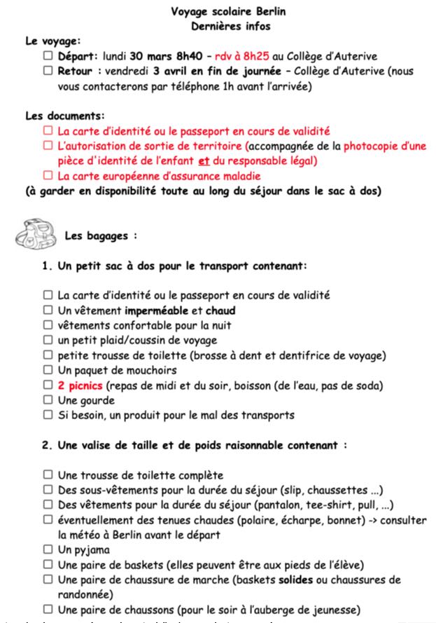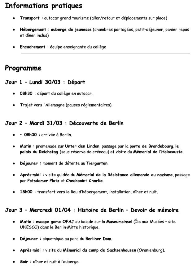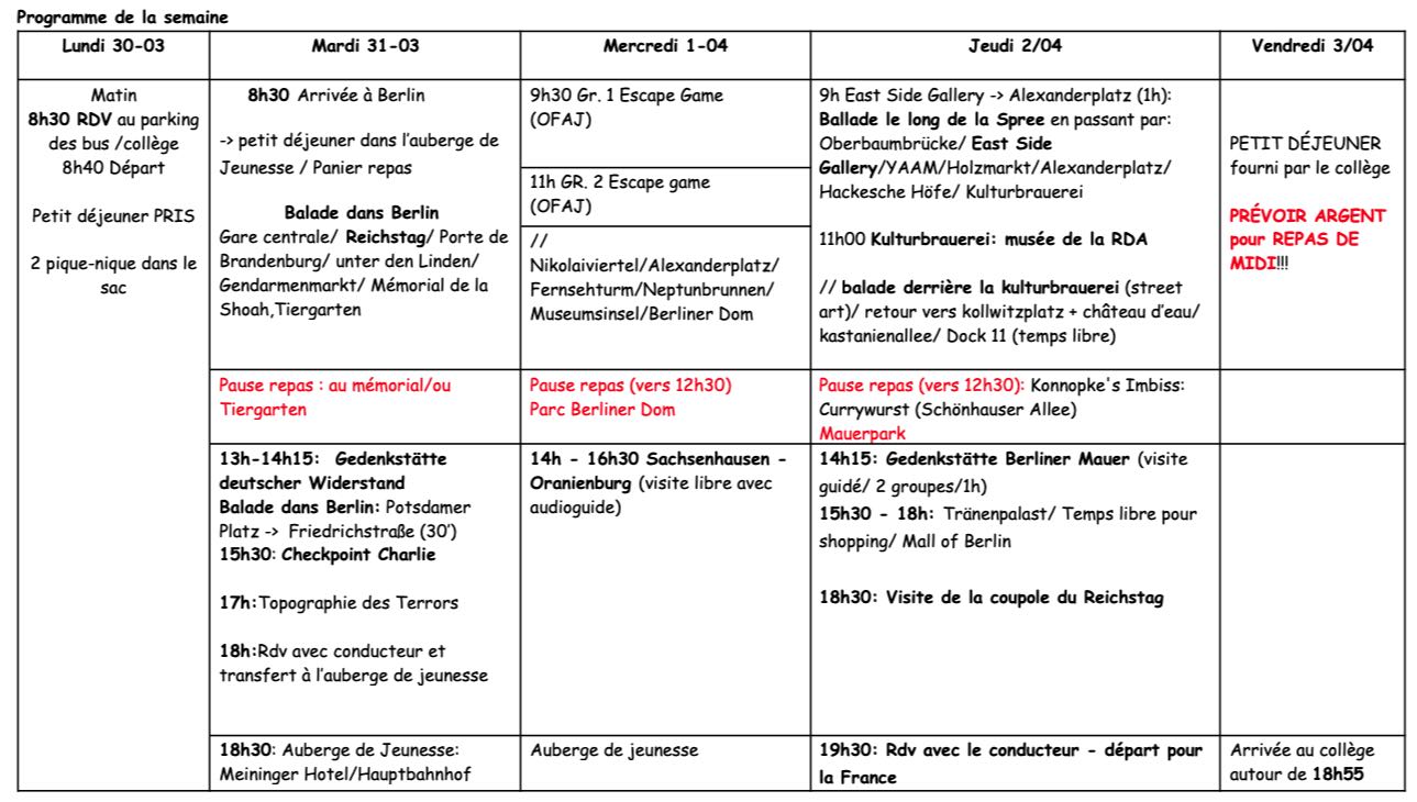 Voici les dernières informations concernant le voyage à Berlin qui aura lieu du 30 mars au 3 avril 2026.