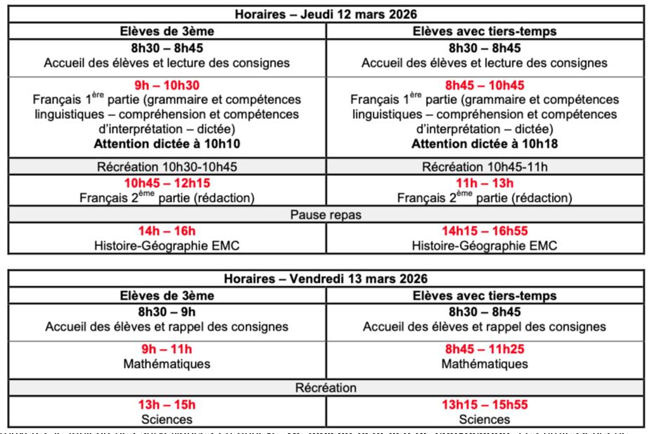 Les élèves, placés dans les salles par ordre alphabétique, se rendent directement dans les salles aux heures de convocations. Les convocations seront données le 9 mars 2026. Les copies d’examen et brouillon sont fournis par le collège. Aucune sortie anticipée n’est autorisée.