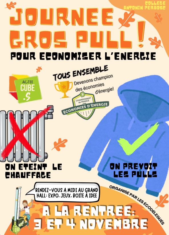 À la rentrée, les 3 et 4 novembre, nous organiserons la « Journée Gros Pull ». Durant ces deux journées, le chauffage sera temporairement réduit afin de sensibiliser les élèves à la maîtrise de l’énergie et aux petits gestes du quotidien qui permettent de préserver notre environnement.