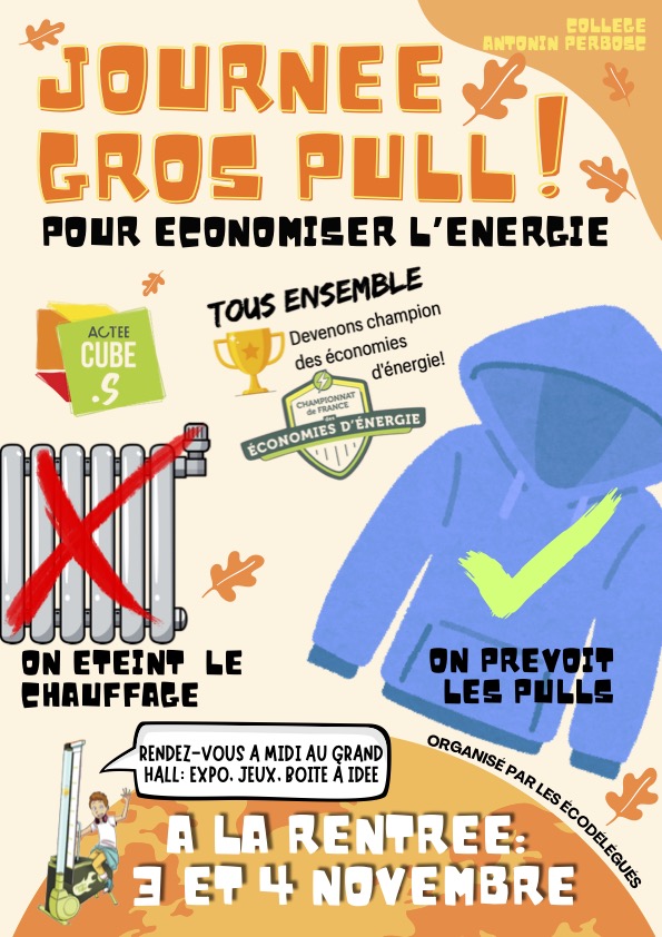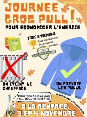 À la rentrée, les 3 et 4 novembre, nous avons organisé la « Journée Gros Pull ». Durant ces deux journées, le chauffage sera temporairement réduit afin de sensibiliser les élèves à la maîtrise de l’énergie et aux petits gestes du quotidien qui permettent de préserver notre environnement.