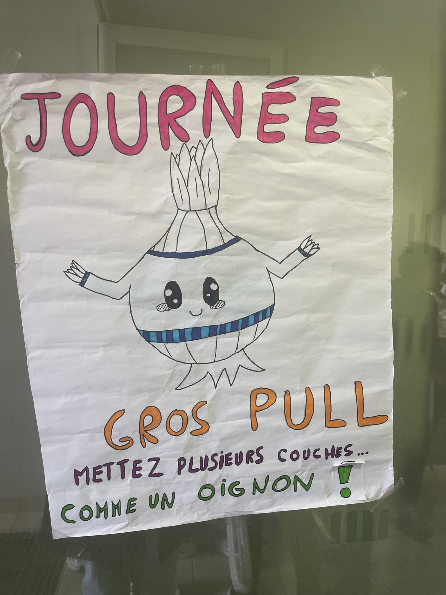 Nous invitons donc les élèves à venir vêtus d’un gros pull ou d’un vêtement chaud — vous trouverez les détails sur l’affiche ci-jointe.